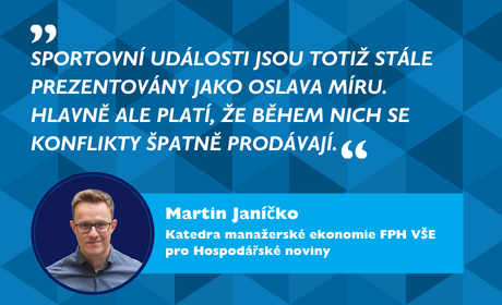 „Sportovní události jsou totiž stále prezentovány jako oslava míru, a to i přesto, že jejich reálný průběh občas připomíná spíš kontrolovanou ventilaci frustrace. Hlavně ale platí, že během nich se konflikty špatně prodávají,“ píše ve svém článku pro Hospodářské noviny Martin Janíčko z Katedry manažerské ekonomie FPH VŠE.